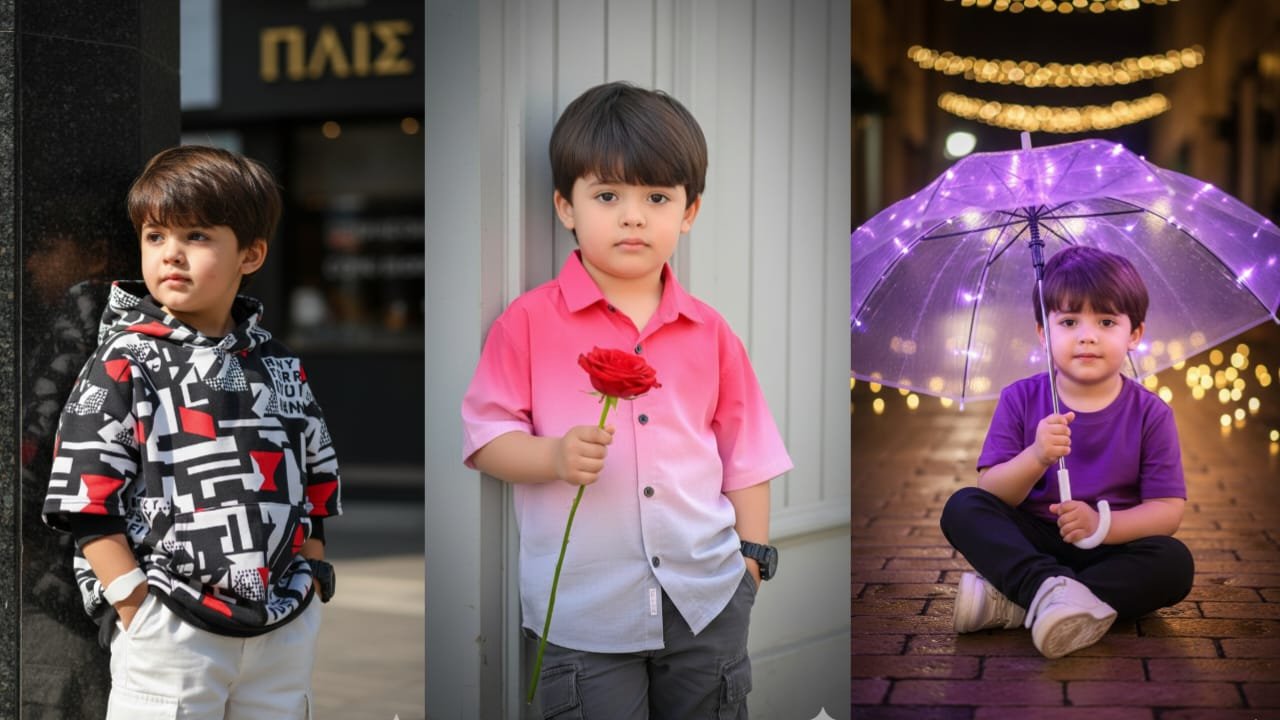 3 ● A hyper-realistic 8k cinematic portrait based of handsome 4-year-old stylish Pakistani boy height (2’2) half body a vibrant, high-fashion portrait of Voluminous hair, He is posing against a dark pillar, looking front side with confidence smile and to the side with a pensive and cool expression. His outfit is a black oversized hoddi in shades of white, black and Red, white cargo pant, The background is blurred, showing ΠΛΙΣ a building with dark tones, possibly a shop or cafe, under bright. Don’t change face keep face 100 percent accurate as to the reference image.