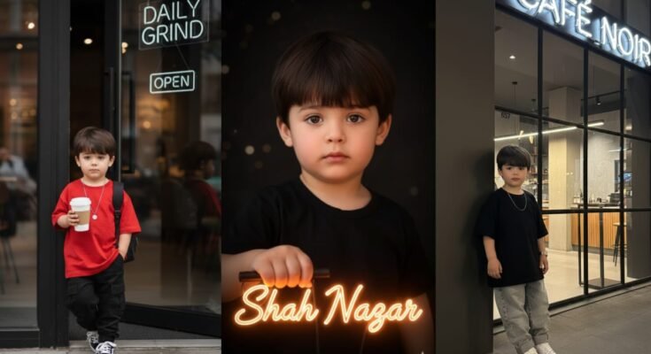 1 ● Ultra realistic, ultra resolution cinematic 8K detail. A 3.5 year old baby boy with same hairstyle with reference image light hazel eyes. He wears a plain black shirt. In his left hand, he is holding glowing text that reads “Shah Nazar” in stylish Javaa font. The glowing letters illuminate his hand and face, casting dramatic warm light on his features. The background is dark, with moody low-key cinematic matic lighting. Photorealistic, Shah Nazar shan Shion dynamic range ange trabal2217 detail.