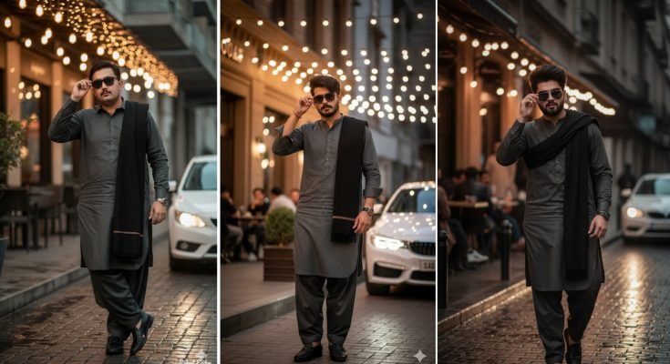 An 18k ultra-realistic full-body portrait of the same young man (use reference face and hairstyle). A handsome Pakistani man in his 20s is standing confidently beside an outdoor cafe, with one leg slightly forward, shoulders relaxed, one hand adjusting his sunglasses,and the other resting casually at his side. He is wearing a dark gray shalwar kameez with a black shawl elegantly draped over one shoulder, and has a stylish beard and dark hair.The camera captures him from a slightly low angle to emphasize his height and presence,showing his full body and the sophisticated urban cafe environment, with string lights and a white car in the background. He is looking slightly off-camera with a composed,model-like expression. Signature: Sohail Editor. Keep his face exactly the same as the uploaded photo; do not change or edit it.