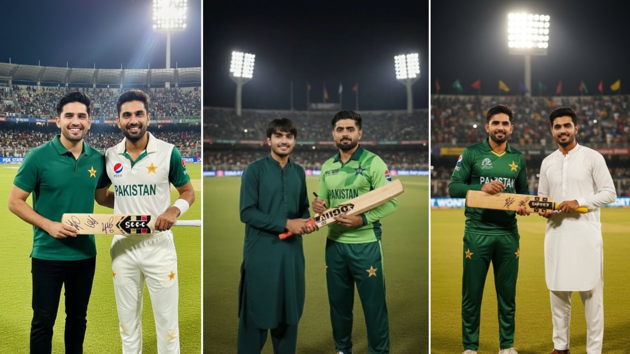 “Standing on a cricket ground beside a famous Pakistani Babar Azam cricketer, both smiling while holding a signed cricket bat. The stadium lights shine brightly, with a full crowd in the background. The scene looks cinematic, sharp, and vibrant, capturing the excitement of meeting a top cricket star.”
