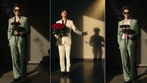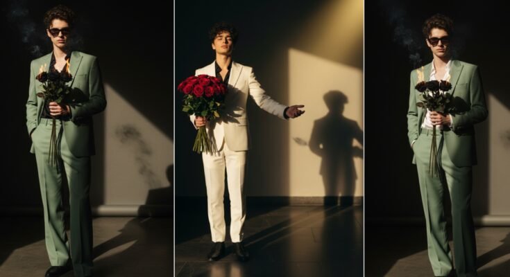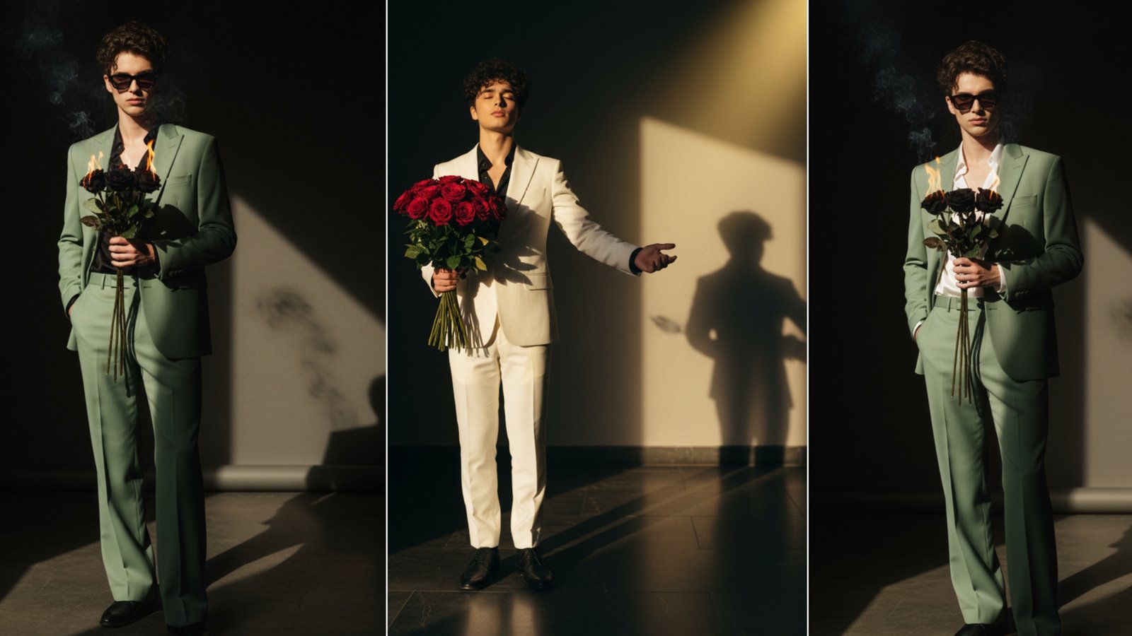 Ultra-realistic cinematic portrait of a stylish young man standing against a dark minimal background with a soft golden sunlight beam casting dramatic shadows. He is wearing a crisp, elegant sage green suit and open button black silk shirt(blazer and wide-leg trousers) with one hand casually in his pocket and the other holding a bouquet of Black burningroses, smock,ashes, lite fire close to his chest.wear black glass.His hair is voluminous and slightly tousled, styled naturally with texture