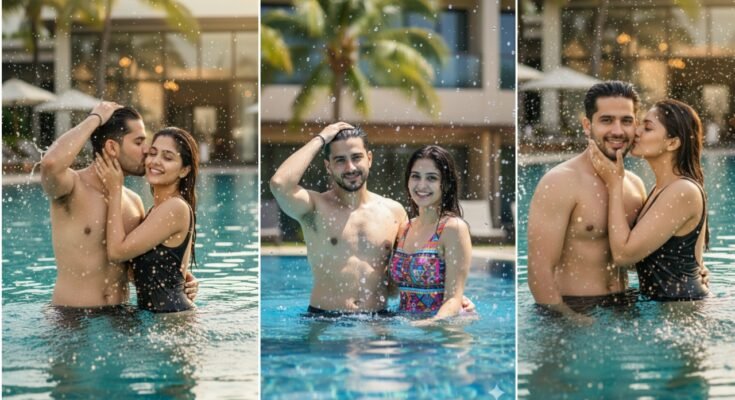 Create an ultra-photorealistic.cinematic portrait. (Using a 100% image as a facial lifestyle portrait of a young man and young women real face, hairstyle, and skin tone Pakistan 100%He is captured mid-action in a clear swimming pool, looking playfully confident at the canmera while running one hand the girl kiss the boy on his face through his wet hair and one hand woman belly. Dynamic splashes of water are frozen mid-hug.