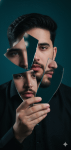 A young man with a neatly groomed beard and styled hair holding a broken piece of mirror in front of his face, reflecting his fragmented image. The background is dark teal with soft lighting highlighting his facial features. The mood is introspective and emotional, symbolizing self-reflection and inner conflict. The shards of glass create a dramatic and artistic effect, showing multiple reflections of his eyes and face. Realistic cinematic lighting, detailed skin texture, moody atmosphere, 4K ultra-realistic portrait, shallow depth of field.Keep my face 100% the same as in the reference image.