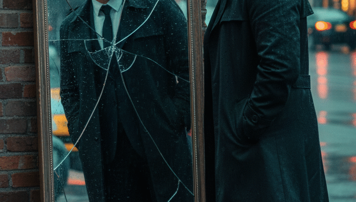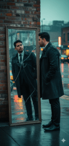 A stylish man standing outdoors on a rainy city street beside a brick wall, gazing into a large cracked mirror leaning against the wall. He is wearing a black trench coat, formal outfit underneath, and black shoes. The reflection in the broken mirror shows his somber expression, creating a moody cinematic atmosphere. Wet pavement reflects city lights and blurred cars in the background. Overcast weather, teal and gray tones, dramatic lighting, high-quality portrait photography, depth of field, 8K resolution, cinematic mood.Keep my face 100% the same as in the reference image.