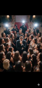 “A confident man in a stylish black suit and sunglasses stands at the center of a glamorous crowd of women dressed elegantly, all looking toward him with admiration and smiles. The man poses with a hand on his chin, exuding charm and confidence. Around him, photographers with professional cameras capture the moment, flashes lighting up the scene. The photo is taken from an overhead angle, creating a circular composition that emphasizes the man as the central focus. The lighting is cinematic, with soft shadows and a luxurious, red-carpet atmosphere.”Keep my face 100% the same as in the reference image.