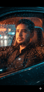 A cinematic portrait of a man sitting inside a car on a rainy night, seen through a window covered with raindrops. The man has a thoughtful, emotional expression, wearing a black shirt with an open collar. Warm orange and cool blue neon lights reflect on the glass and illuminate his face, creating a moody, dramatic atmosphere. The background shows soft bokeh lights of the city at night. Shallow depth of field, high-quality lighting, ultra-realistic photography style, 8K resolution, film look, soft shadows.Keep my face 100% the same as in the reference image.