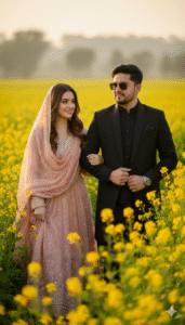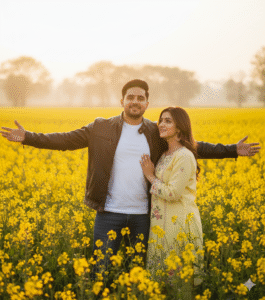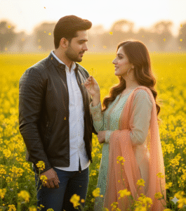 “A romantic couple standing together in a beautiful mustard flower field during golden hour. The man is wearing a black leather jacket over a white shirt and blue jeans, smiling with open arms. The woman is wearing a soft pastel traditional dress in shades of pink and white with a light dupatta flowing gently in the breeze. The yellow mustard flowers bloom around them, creating a dreamy, cinematic, and romantic countryside vibe. Warm natural sunlight, soft background blur, and peaceful expressions — perfect couple outdoor shoot.”