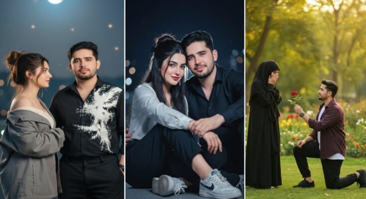 An ultra-realistic cinematic portrait of a young couple. The woman has her hair tied in a messy ponytail and wears a casual off-shoulder jacket. The background is softly blurred with a faint moon visible in the sky, creating a dreamy, magical atmosphere. The overall toneois intimate, peaceful. The man faces the camera slightly and wears an elegant black and vibrant white shirt with black loose cargo pants, Ensure the man’s face is 100% identical to the reference image. Don’t change Facekeep my face 100% as my refrence image.