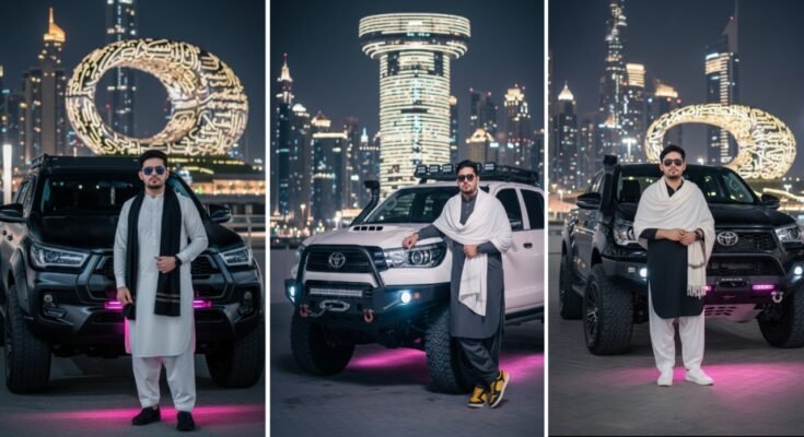 A ultra-realistic 4k cinematic of 27 year oldyoung man standing with White Toyota Hilux with full modified, He is wearing a dark gray shalwar kameez with a White shawl elegantly draped over one shoulder,wearing black sunglasses,yellow-black sneakers, Man Stand in casually and comfortable with luxury style, pose, one band on car for resting, cityscape background with full view of Museum of The Future Dubai night view with multiple buildings softly & Add Pink Light In The Bottom Of Hilux.Dont Change The Face 100 Percent Reserved.