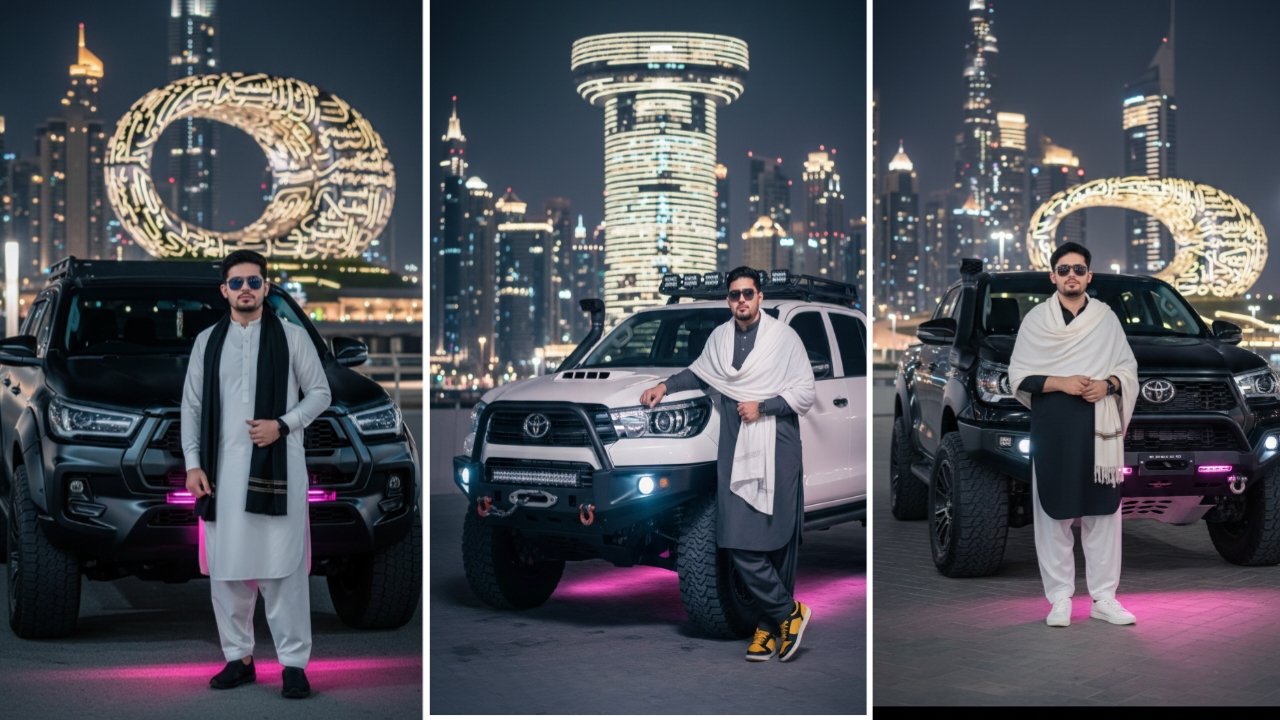 A ultra-realistic 4k cinematic of 27 year oldyoung man standing with White Toyota Hilux with full modified, He is wearing a dark gray shalwar kameez with a White shawl elegantly draped over one shoulder,wearing black sunglasses,yellow-black sneakers, Man Stand in casually and comfortable with luxury style, pose, one band on car for resting, cityscape background with full view of Museum of The Future Dubai night view with multiple buildings softly & Add Pink Light In The Bottom Of Hilux.Dont Change The Face 100 Percent Reserved.