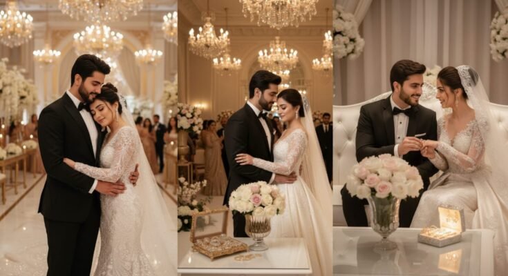 The mood is ultra-elegant, romantic, and glamorous, with hyper-realistic detail, natural emotion, and cinematic depth.