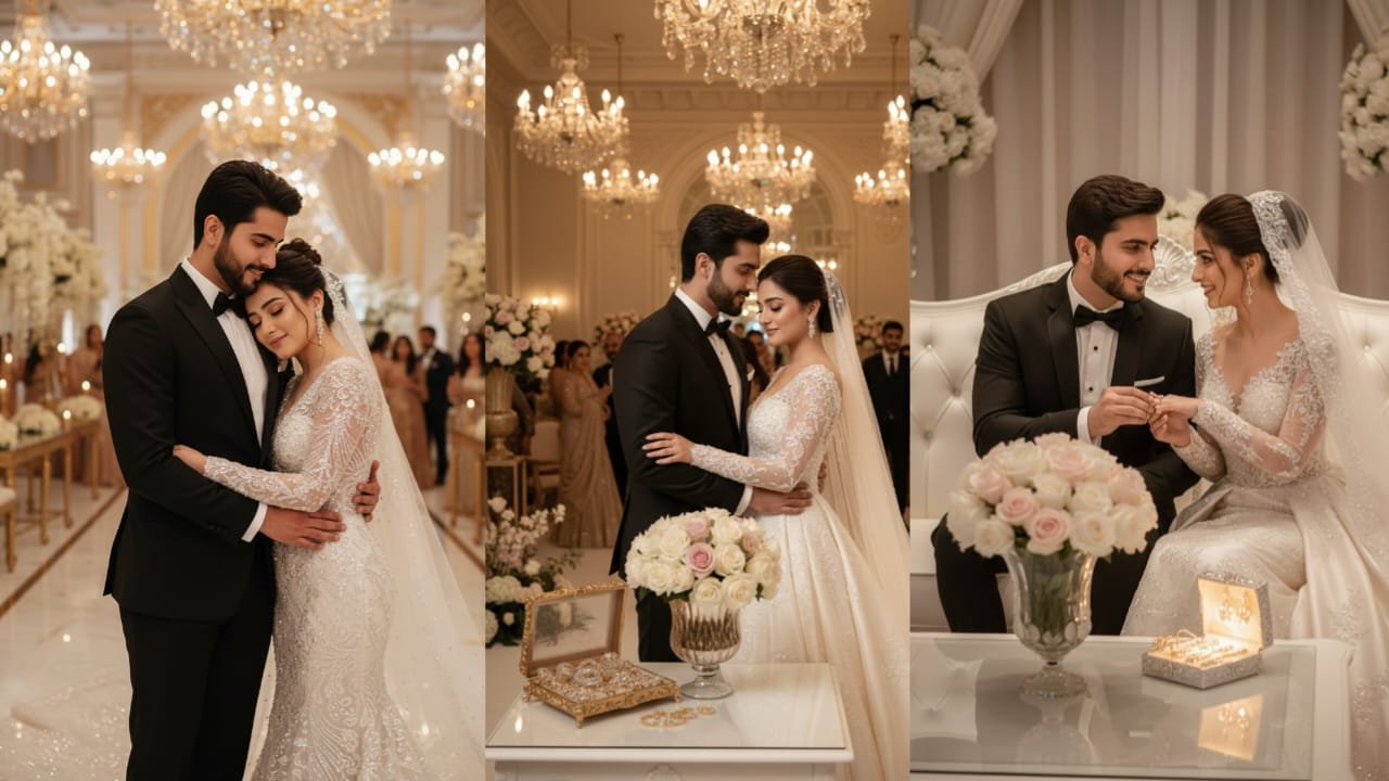 The mood is ultra-elegant, romantic, and glamorous, with hyper-realistic detail, natural emotion, and cinematic depth.