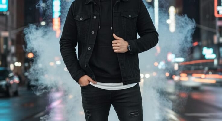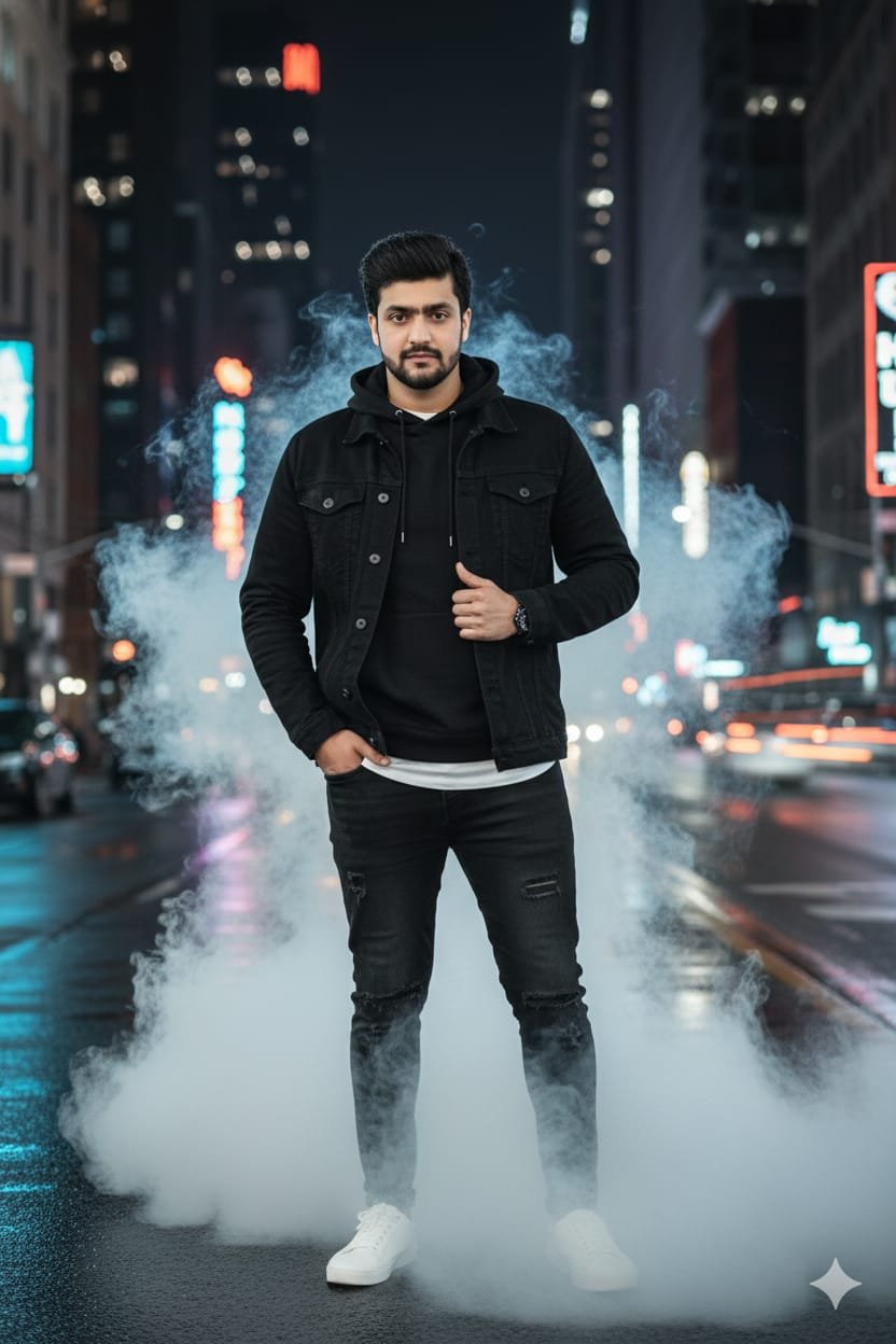 1● A stylish young man with dark hair and a well-groomed beard stands confidently on a city street at night. He is wearing a black denim jacket over a black hoodie and a white t-shirt, paired with distressed black jeans and clean white sneakers. His left hand is casually in his pocket, while his right hand holds the lapel of his jacket. A cloud of white smoke or fog envelops him from the waist down, creating a dramatic effect. In the blurred background, neon lights of city buildings and streaking Keep my face 100% same as in the reference image