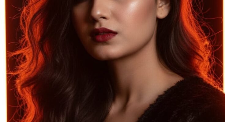 The lighting is a key element in the photo. It’s warm, with a rich, orange-red glow that casts strong highlights and shadows across her face and body. It appears she is standing between two vertical strips of bright, glowing lights, possibly LED strips or bulbs, which create a halo effect and add a sense of drama to the composition. The background is dark and out of focus, which keeps all the attention on the woman. She’s also wearing what looks like a black, furry top or coat that adds texture to the image.