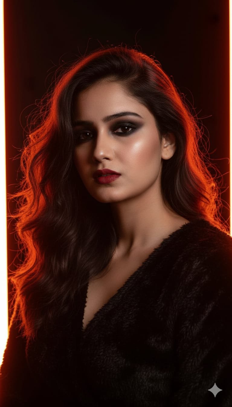 1●Create a photo shoot : This is a striking, dramatic portrait of a woman with a moody, intense expression. Her dark, wavy hair is tousled, framing her face and highlighting her features. She has a deep, smoky eye makeup look and her lips are painted a bold, dark red, which gives the image a sense of sultry allure.