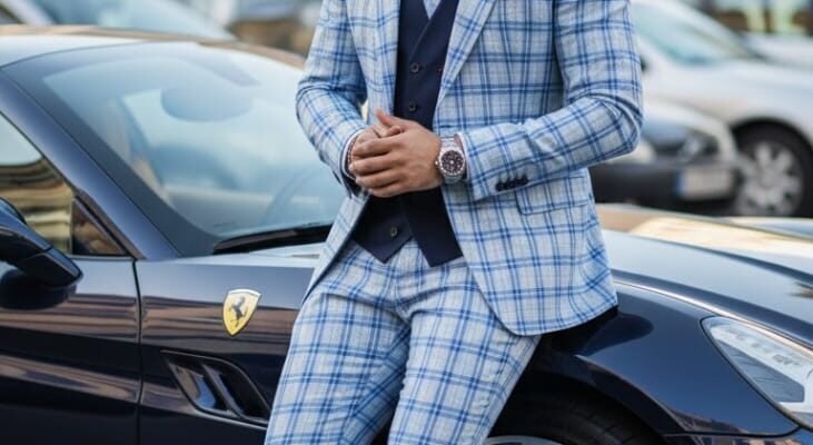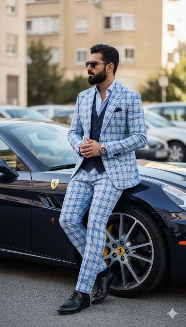 3 ● “A stylish man with a beard and sunglasses leaning confidently against a luxury black Ferrari sports car, wearing a blue and white checkered suit with a navy vest and light blue shirt. The man is dressed elegantly with black dress shoes and a wristwatch, posing outdoors in a modern urban area with buildings and parked cars in the background. The lighting is natural and highlights the classy, successful, and fashionable vibe of the scene — cinematic style, high detail, realistic look.”Use 100% face above uploaded photo.