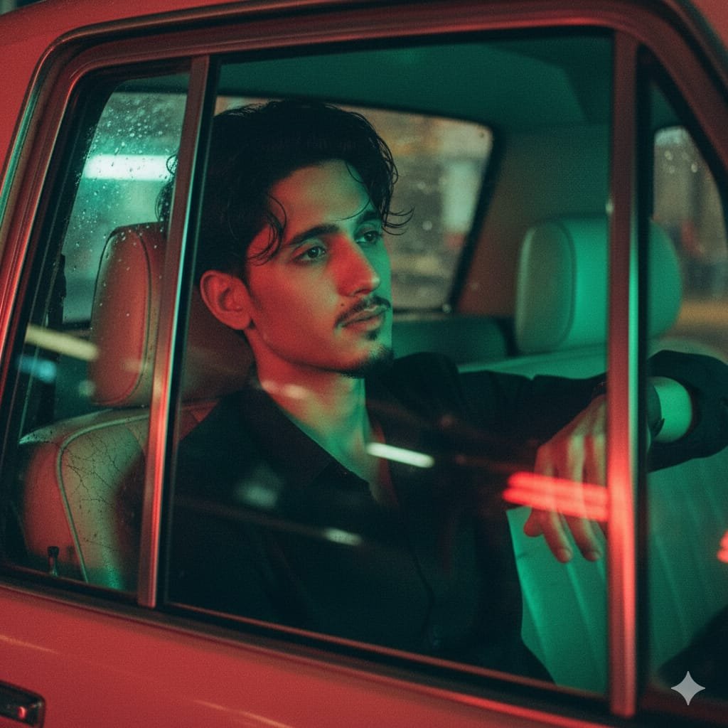 2 ●Wong Kar-wai style realistic portrait Using photo uploads as a face model, emphasizing the jawline and neck to be sharp as a sculpture, the same face and uniqueness. Posture: sitting with head leaning on mirror, hands on the edge, eyes staring at the street light. Scene: Inside an old taxi. Pale leather seats. Rain-smudge windows. Street lights streak blur. Camera Angle: Taken from outside the mirror. Shadows reflecting on the face. Lighting: Neon red-green running through. Face changes color according to light. Clothes: Black button down shirt. Slightly relaxed. Hair is wet. Image tone: Contrast red-green. Film grain thick. Motion blur clear. Glow blur around car light. Mood: Lonely, solitary, big city with no answers