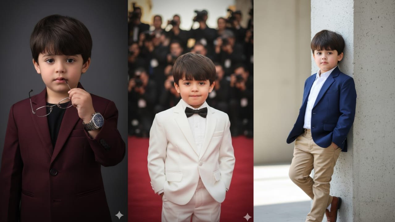 2 ●Handsome baby boy prompt 3 year old “Recreate the photo of the young boy in the navy blazer and khaki pants, focusing on the same pose, composition, and styling. The subjecte should be a [Your Age/Age Range khaki na n the same pose, [Male/Female/Person] wearing a a composition, and styling. The subject blue blazer, a crisp white shirt, and khaki or tan slim-fit pants. The pose should be relaxed, with one foot crossed casually over the other, hands slipped partially into the pockets, and the back resting OD against a textured, neutral wall or pillar (like concrete or stone). Ensure the kl lighting is bright and natural, highlighting the contrast between the dark blazer and light pants, and maintaining a smart-casual and confident expression.”Make sure the face is 100% same as in the reference image.