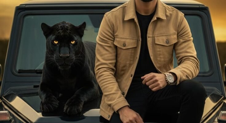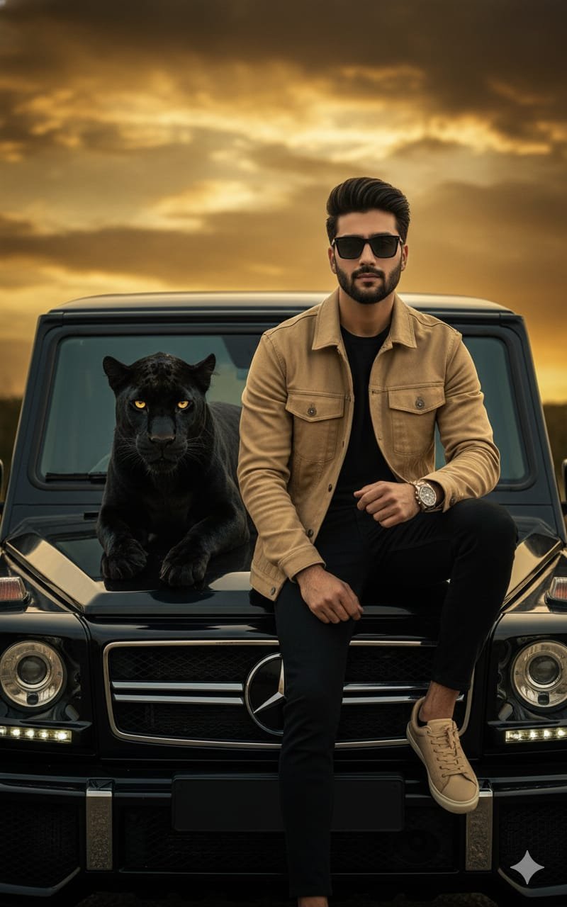 DhdhUltra realistic DSLR photo, cinematic lighting, one stylish man sitting confidently on the front of a black Mercedes G-Wagon, wearing beige jacket, black shirt, black pants, beige sneakers, and black sunglasses, modern hairstyle, luxury watch visible.