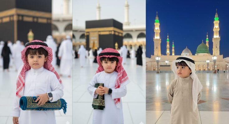 A hyper-realistic portrait of a 3.5 year baby boy standing in the courtyard of Masjid an-Nabawi, Madinah. The magnificent green dome of the Prophet’s Mosque rises beautifully in the background, along with the elegant white minarets and golden umbrella shades. The Baby Boy is dressed modestly (in white ihram or simple traditional attire), looking peaceful and humble, with hands raised in dua. The warm golden lights of the mosque glow against the evening sky, casting a soft, spiritual radiance. The atmosphere feels sacred and serene, filled with devotion and tranquility. Ultra-detailed, lifelike, cinematic realism, professional photography style.Keep My face orginal with reference image