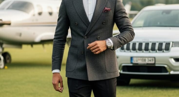 Focus Keywords (for AI generation): Tailored suit, bespoke, Rolls-Royce, double monk strap, modern dapper gentleman, sophisticated, cinematic lighting, low angle, shallow depth of field, street photography, business executive, style.