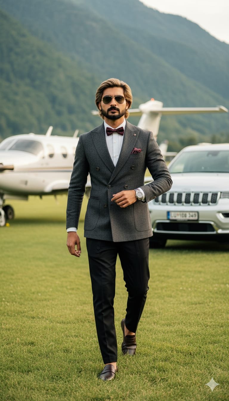 **Outfit:** He wears a charcoal grey or olive green **double breasted blazer** with a classy italian shirt with classy boo tie**, black gurkha phant, and dark classy lather penny loafers. He is wear a pair of aviator sunglasses and has a luxury wristwatch on his left.